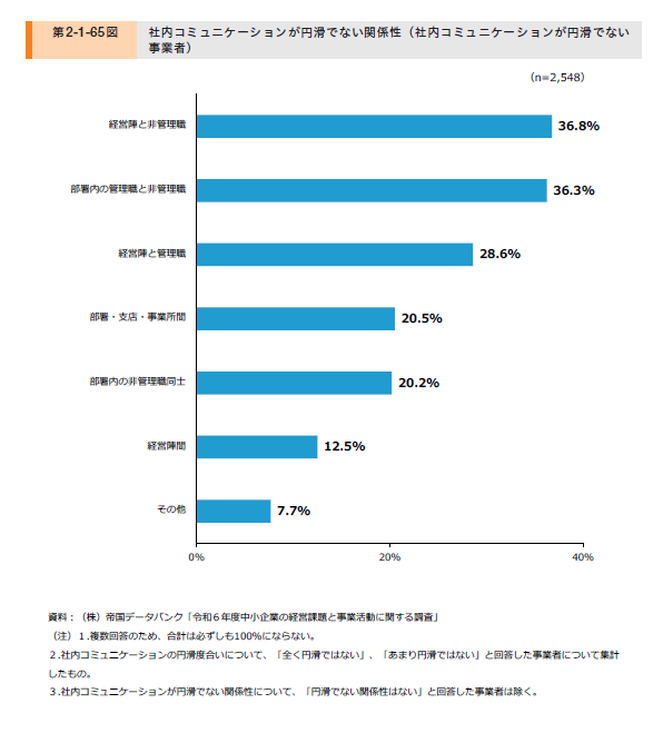 中小企業庁が発表している「2025年版中小企業白書」によると、社内コミュニケーションが円滑でないと回答した企業において、円滑でない関係性として「経営陣と非管理職」のみならず「部署内の管理職と非管理職(=直属の上司と部下)」の回答割合が高いことが指摘されています。従業員の身近な関係(上司と部下)からコミュニケーションを改善することが、風通しの良さや心理的な働きやすさにつながると分析されています。