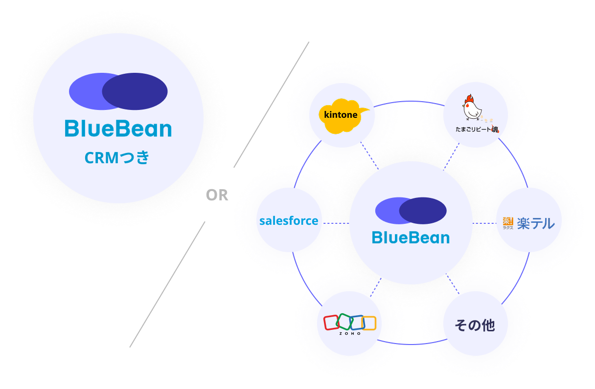 BlueBeanは標準搭載のCRMに加え、Salesforceなどの他社システムとも連携可能です。標準搭載CRMなら初期費用を抑えてすぐに使い始められ、他社システム連携なら使い慣れたシステムをそのまま活用できます。いずれの場合も、顧客情報の一元管理やお客様一人ひとりに合わせたスムーズ顧客対応などを通して、顧客対応の質向上と業務効率化に貢献します。