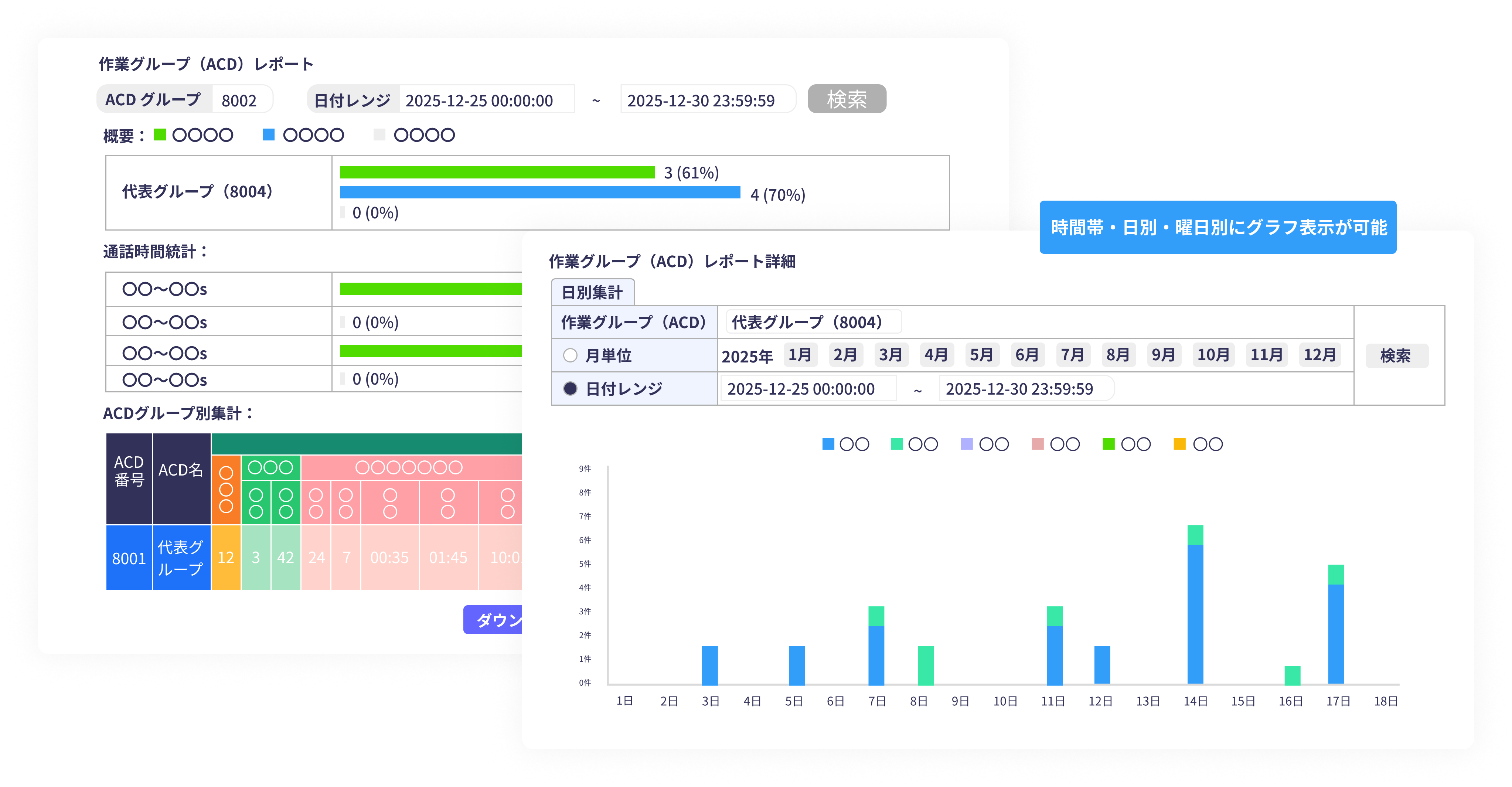 - 業務ごとのコール数や通話時間、破棄呼の集計で業務成績の管理