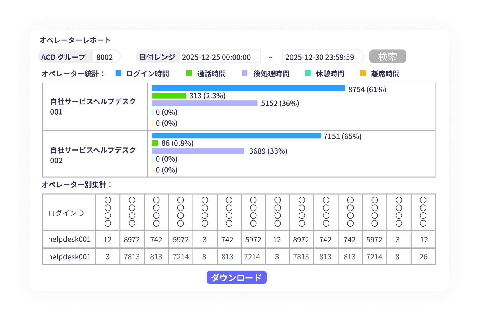 - オペレーター毎の通話時間や後処理時間、休憩回数、稼働率を集計して成績管理