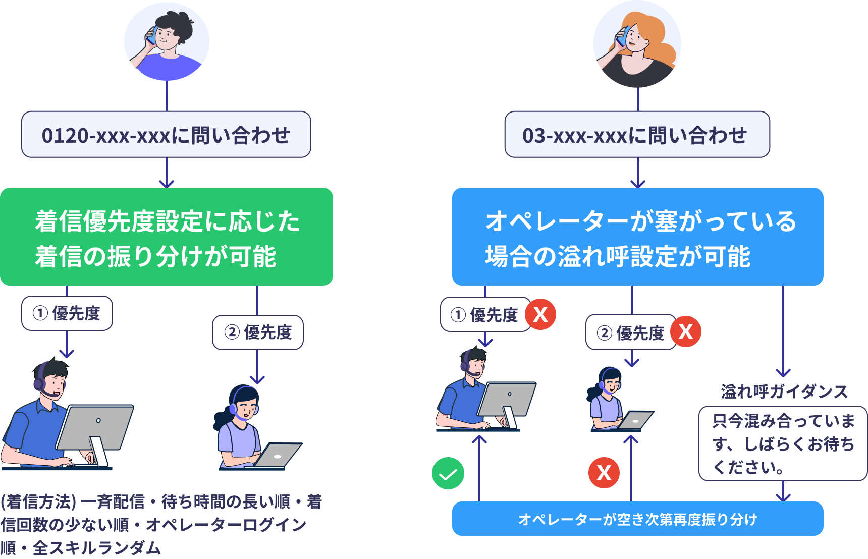 業務の内容や状況によって、新人とベテランでスキルレベルに差を付け着信頻度を調節し、スムーズな業務運営を行うことが可能となります。