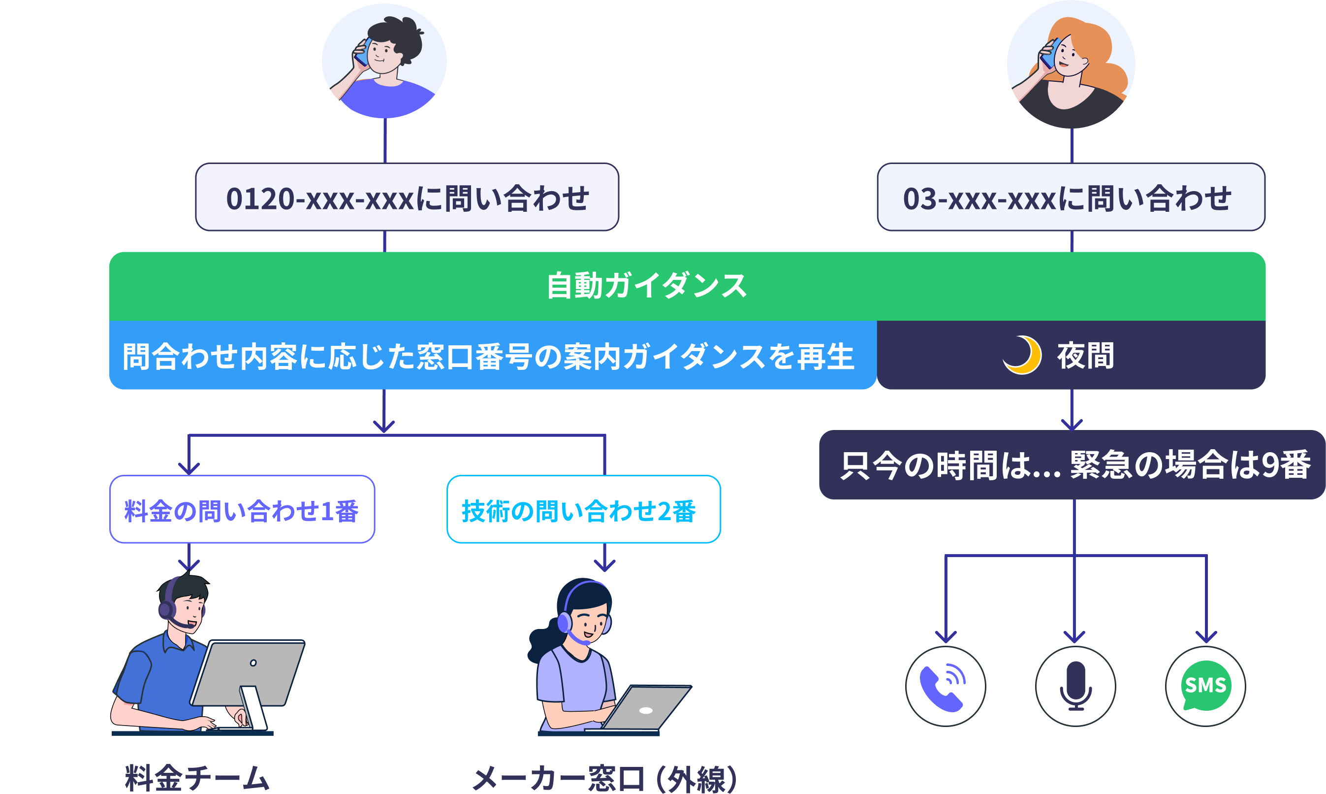 - 営業時間外に入った問合せに対し、音声ガイダンスによる対応