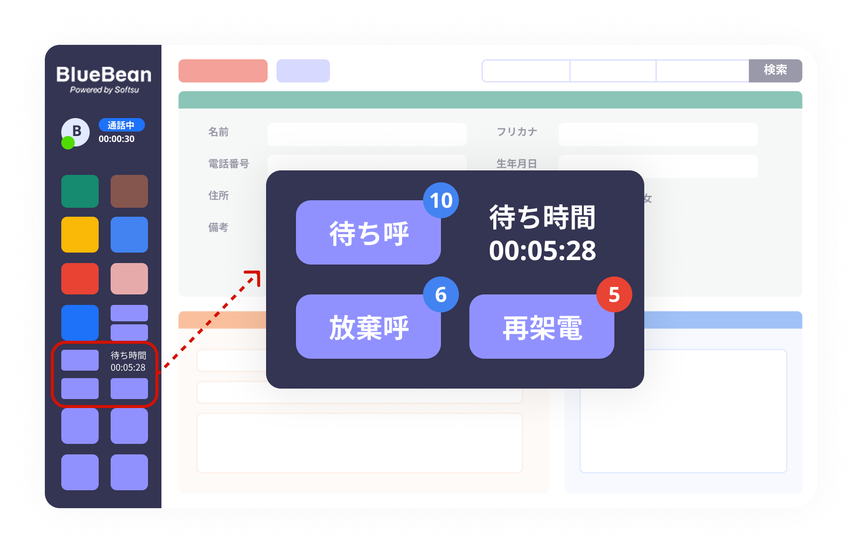 BlueBeanのオペレーター画面は多彩な機能を搭載しており、アウトバウンド業務・インバウンド業務問わず、オペレーターにとって使いやすい仕様となっております。