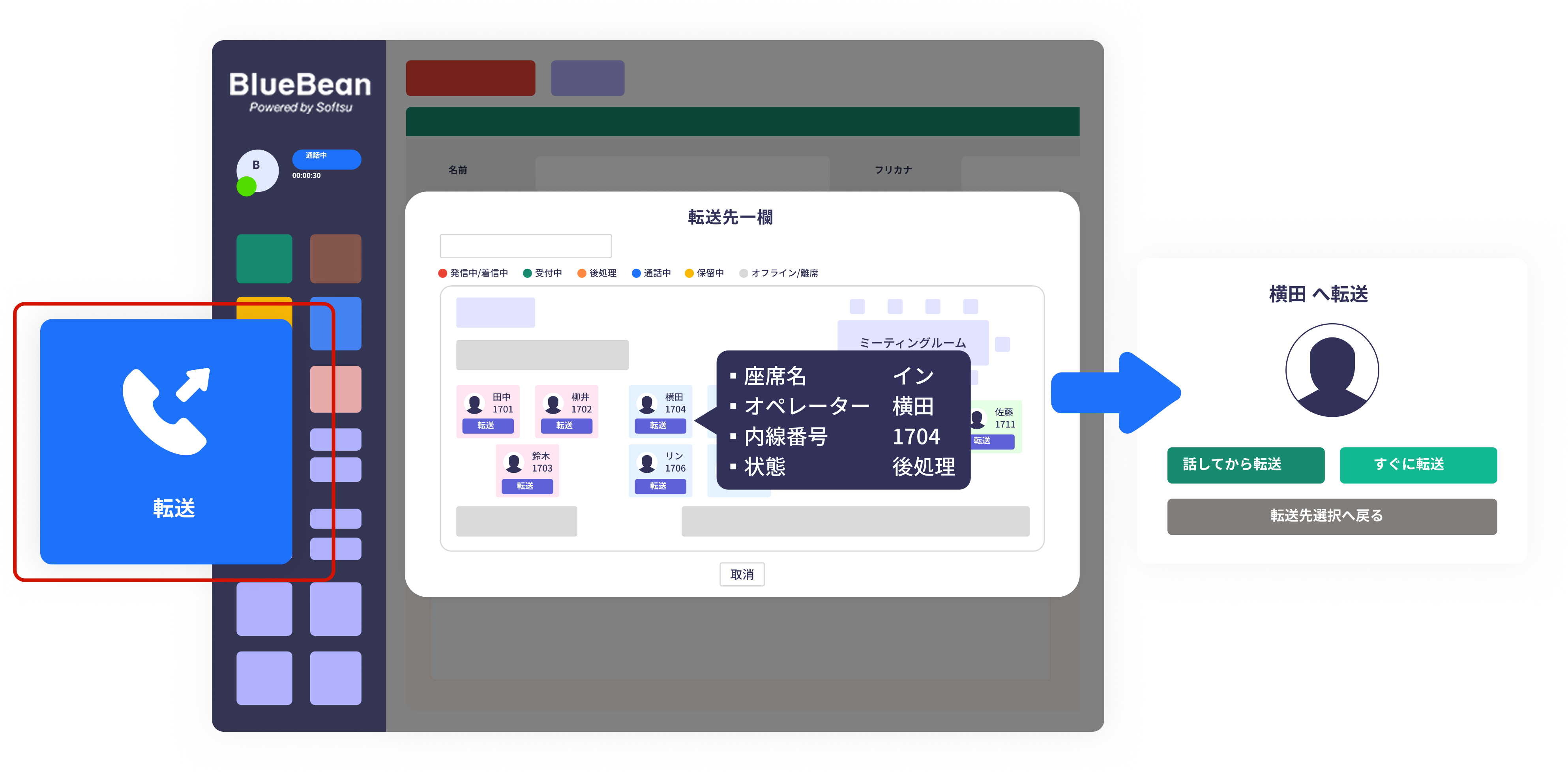 転送ボタンを押すと、座席一覧が転送先一覧として表示されるので直感的に状況を確認することができます。保留転送※1やブラインド転送※2にも対応しているので、電話機での操作方法を覚える必要はありません。