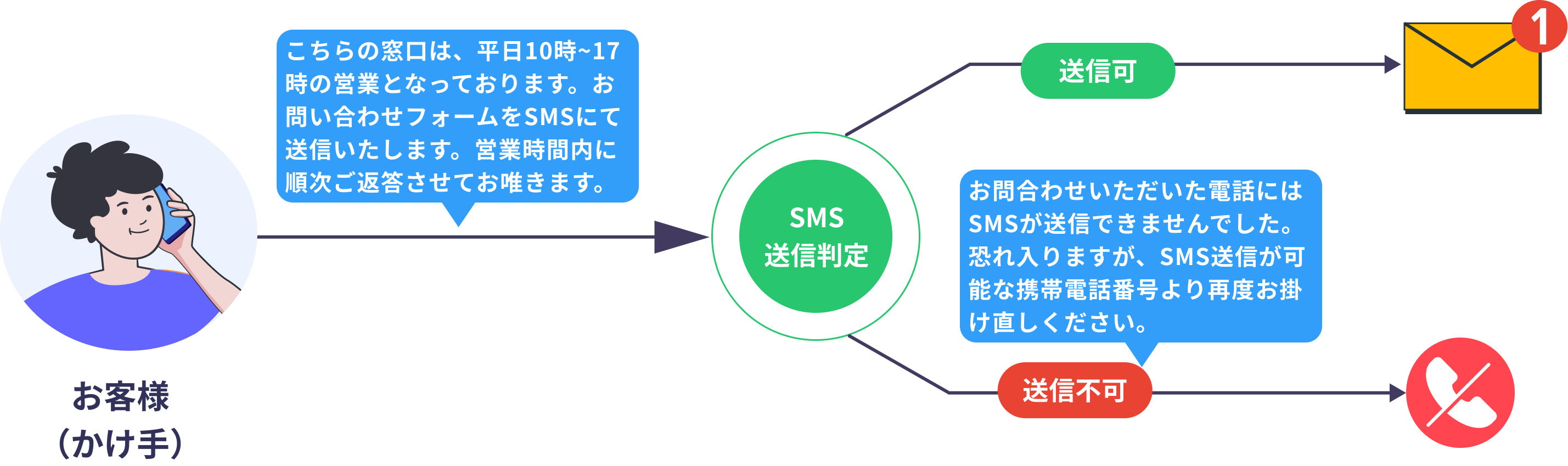 IVR経由にてSMS送信が可能となり、着信に対して自動でSMSの送信ができます。