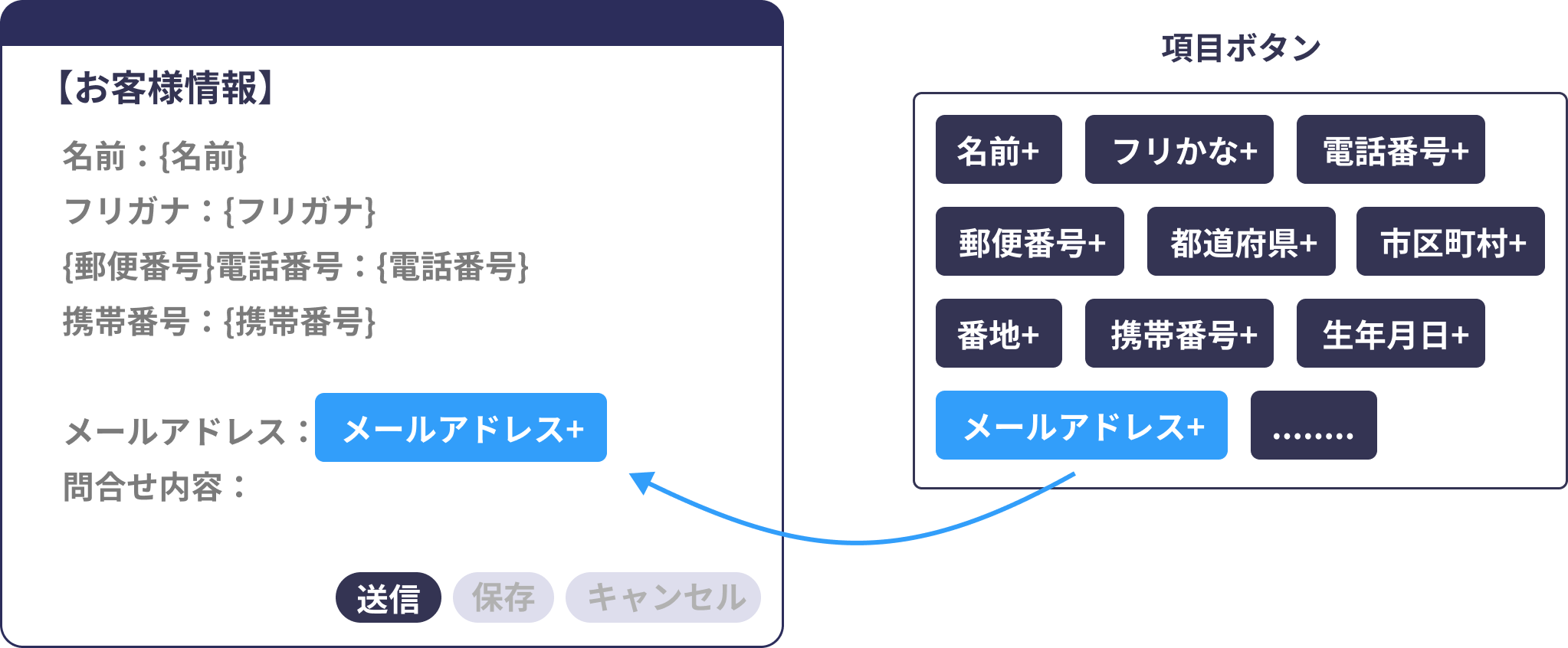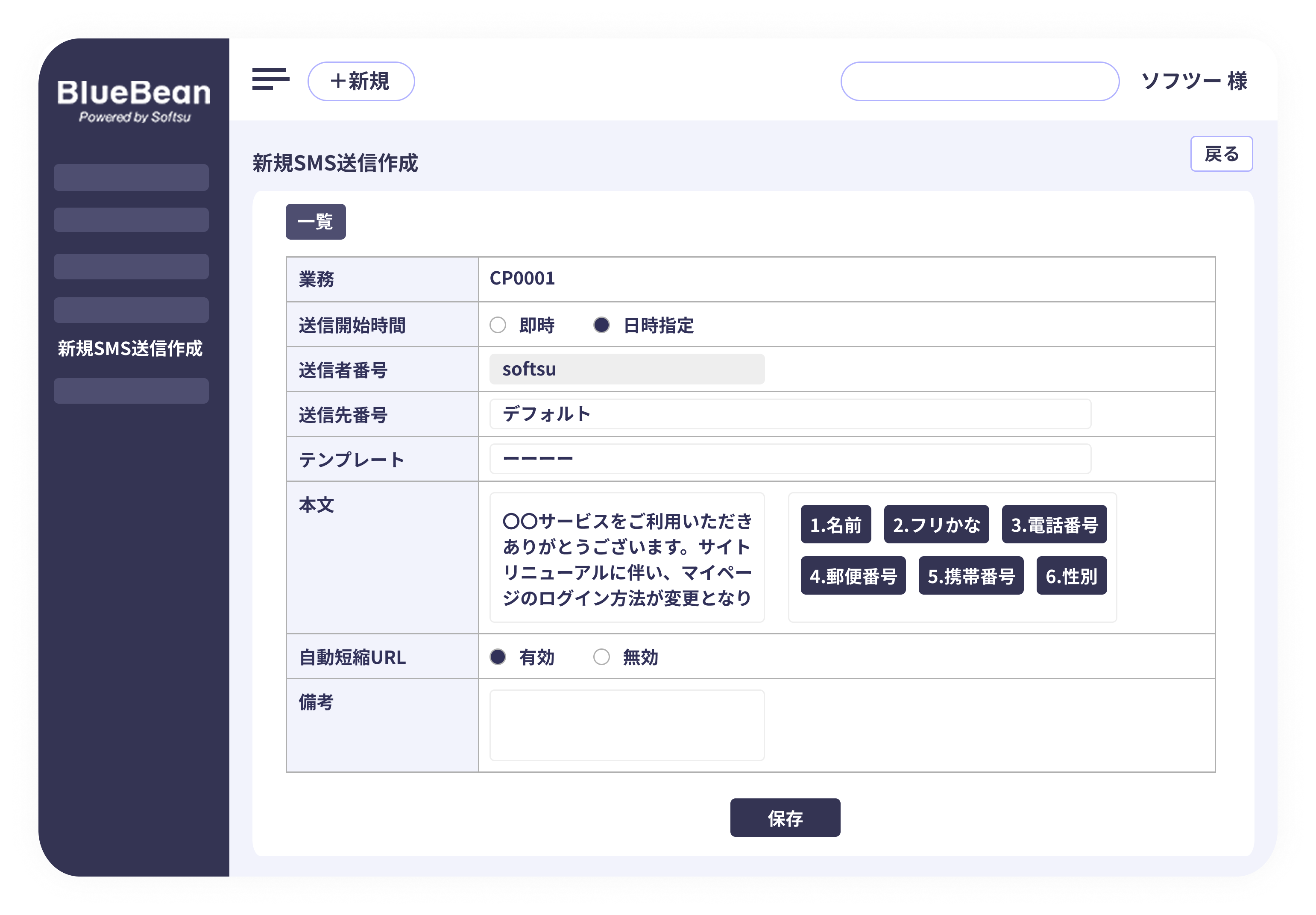 BlueBeanに登録された顧客に対して送信する際に「名前」「電話番号」「住所」等の項目ボタンを選択するだけで、SMSの本文の文面内にワンクリックで顧客情報カード項目の内容が入力されます。