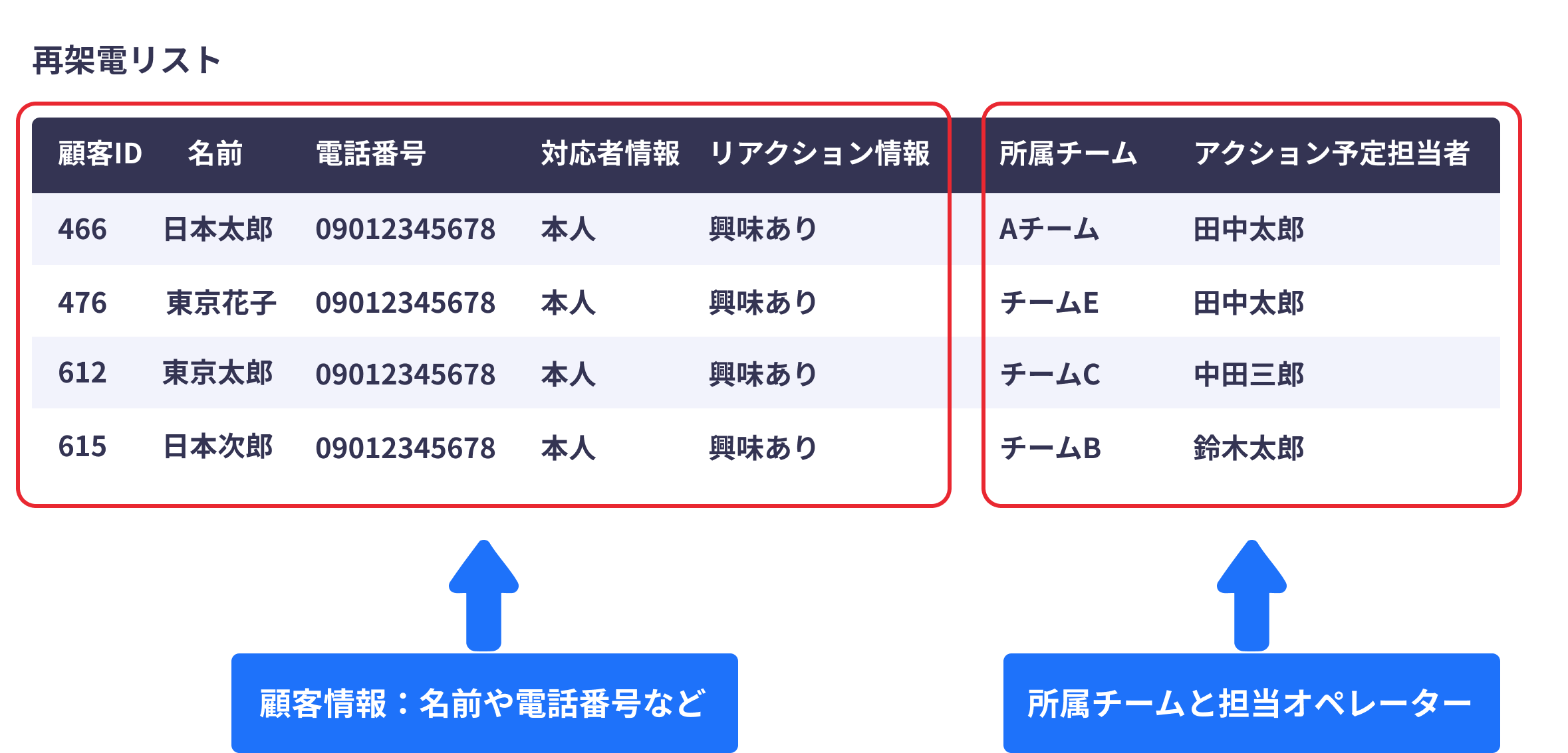 - 管理者による再架電の管理を行い、適切なオペレーターに再架電の割り当て