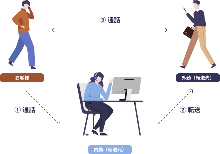 担当者が外出中でもそのままスマートフォンに転送が可能です。保留転送では、転送前に社外にいる転送先の方と話をしてから電話の転送ができるので、相手の状況に配慮した対応ができます。