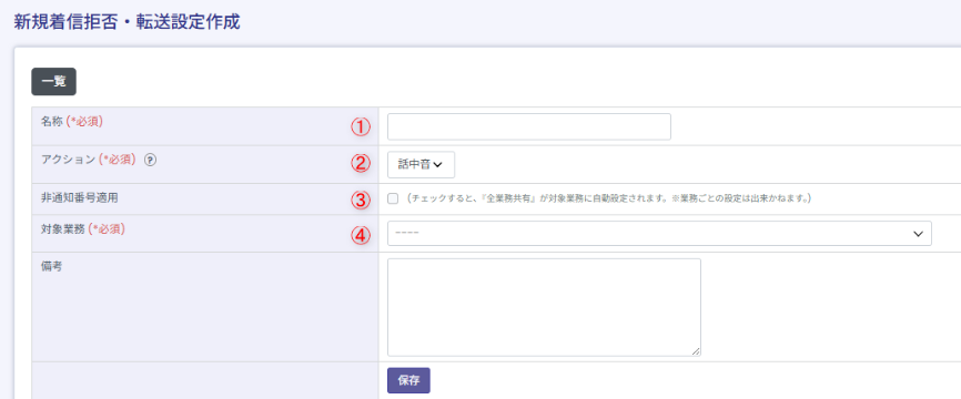 | ③非通知番号適用 | チェックすると、『全業務共有』が対象業務に自動設定されます。※業務ごとの設定は出来かねます。 |