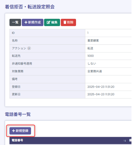 これにより任意の電話番号の着信拒否設定や転送設定が可能となります。