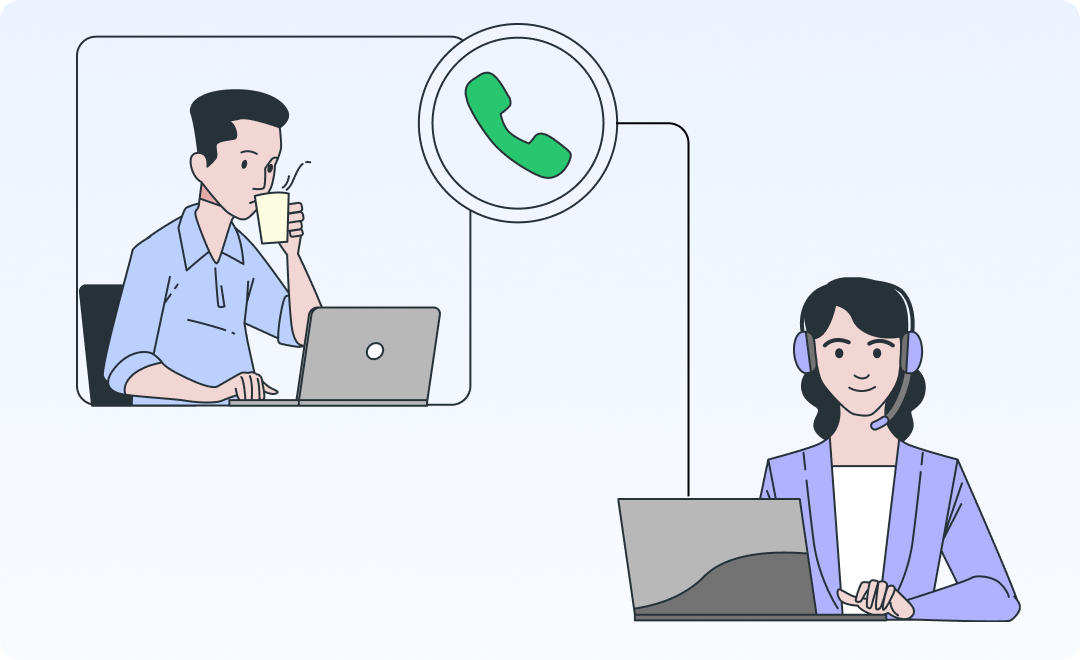 リアルタイムモニタから、モニタリング・ささやき機能を利用する事が出来ます。通話時間が長い在宅勤務をしている新人へリアルタイムでフォローする事が可能です。