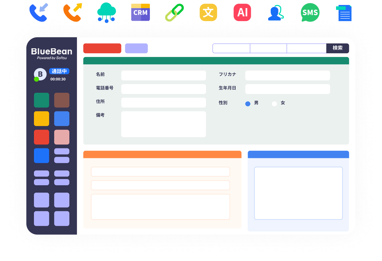 クラウドCTIコールセンターシステム BlueBeanは、コロナ時代のテレワークにおける電話対応に最適なソリューションです。 BlueBean1つでコールセンター・オフィス電話の併用が可能なので、コールセンター用・オフィス電話用と電話システムを分ける必要はありません。インターネットとPCがあればどこでも利用ができるので、社内外問わず電話の受架電が可能です。 また、突然の自然災害や事故が発生しても業務を継続させるBCP対策としても有効です。