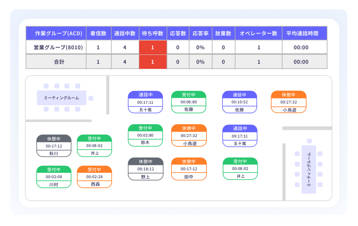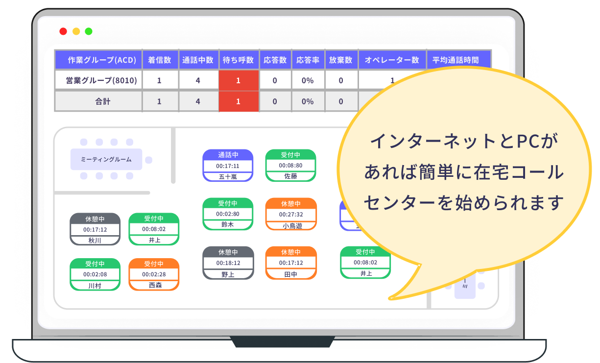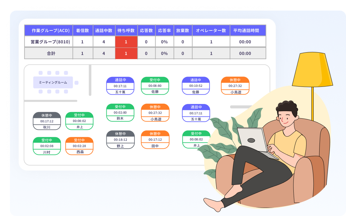BlueBeanにはリアルタイムモニタ機能が標準で搭載されています。 テレワーク中のオペレーターのステータスが一覧で確認できるので、在宅勤務の管理者でも柔軟な対応が可能です。